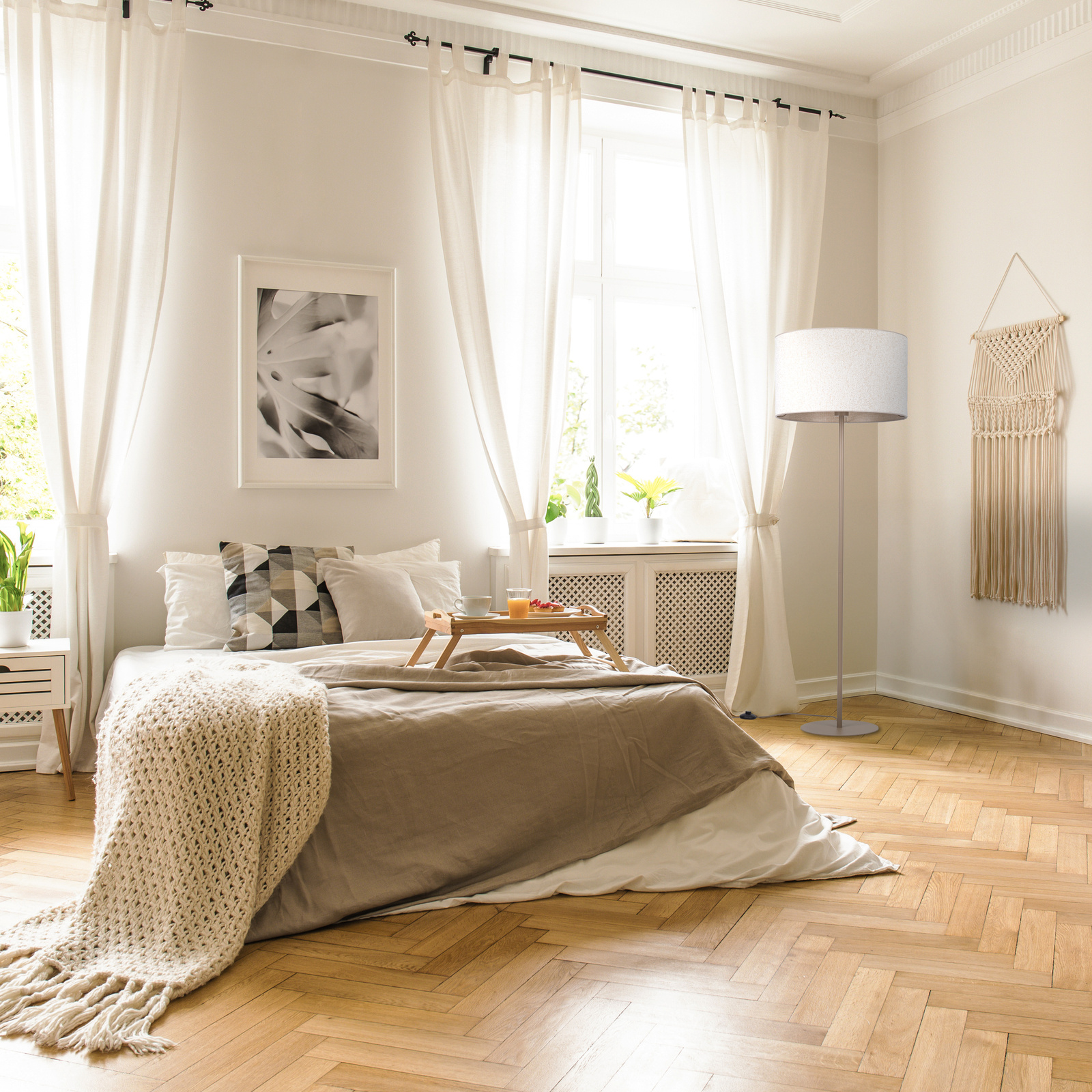 Vellum to kompletna rodzina lamp, która wprowadza do wnętrza miękkie, przytulne światło i spokojną, elegancką estetykę. Charakterystyczny, cylindryczny klosz wykonany jest z tkaniny typu bouckle – o wyraźnej, „pętelkowej” strukturze, która pięknie rozprasza światło i dodaje aranżacji przytulności. Kolekcja dostępna jest w dwóch wyrafinowanych wykończeniach kolorystycznych – jasnym beżu oraz szarości w stylu „pieprz i sól”. Kontrastująca wewnętrzna strona klosza subtelnie podkreśla jego kształt i nadaje lampom wyrazistego charakteru. Rodzina Vellum obejmuje zwisy sufitowe, lampy podłogowe oraz plafony, dzięki czemu można oświetlić całe wnętrze w jednym, spójnym stylu. Zwisy świetnie prezentują się nad stołem lub w centrum salonu, plafony są idealne do niższych pomieszczeń, korytarzy i przedpokojów, a lampy stojące wprowadzają dodatkowe, nastrojowe światło w strefie wypoczynku. Proste, smukłe stelaże w czerni lub cieplejszym, złotawym odcieniu harmonijnie łączą się z fakturową tkaniną bouckle, pasując zarówno do aranżacji skandynawskich, boho, jak i nowoczesnych. Wszystkie modele Vellum wyposażone są w oprawkę na standardowe źródło światła E27, co pozwala dobrać moc i barwę światła do indywidualnych potrzeb – od funkcjonalnego, jasnego oświetlenia, po delikatne, wieczorne światło relaksacyjne. To kolekcja dla osób, które cenią prostotę formy, przytulny klimat i możliwość kompleksowego, a zarazem estetycznie spójnego oświetlenia swojego domu.